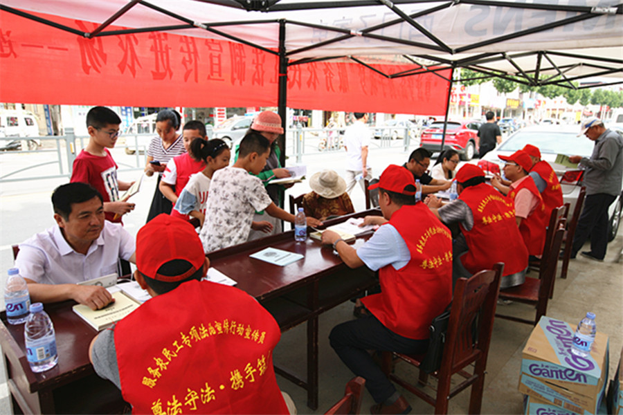活動(dòng)中,連云港市總工會(huì)法務(wù)部高立軍、蒼梧律師事務(wù)所律師趙歐、萬(wàn)磊善,淮工法學(xué)院講師、律師辛長(zhǎng)青等一行7人,為農(nóng)民工分別講解了連云港市總工會(huì)印制的《服務(wù)農(nóng)民工專項(xiàng)法治宣傳手冊(cè)》勞動(dòng)合同篇、工資工時(shí)篇、社會(huì)保險(xiǎn)篇、工傷保險(xiǎn)篇、職業(yè)病篇和《江蘇省“一辦法七條例”法規(guī)匯編》等涉及農(nóng)民工切身利益的法律法規(guī)。介紹了農(nóng)民工在用人單位享有的按時(shí)足額領(lǐng)取工資、休息休假、簽訂勞動(dòng)合同等多項(xiàng)基本權(quán)利;講解了農(nóng)民工可以通過(guò)雇傭雙方協(xié)商、勞動(dòng)爭(zhēng)議調(diào)解、人社局仲裁院仲裁等途徑進(jìn)行維權(quán)。為了快速有效普及維權(quán)法律知識(shí),將枯燥的法律名詞轉(zhuǎn)換成最直白的語(yǔ)言,通過(guò)法律援助實(shí)際案例、集市現(xiàn)場(chǎng)與農(nóng)民工互動(dòng)交流,深受廣大農(nóng)民工的熱烈歡迎。