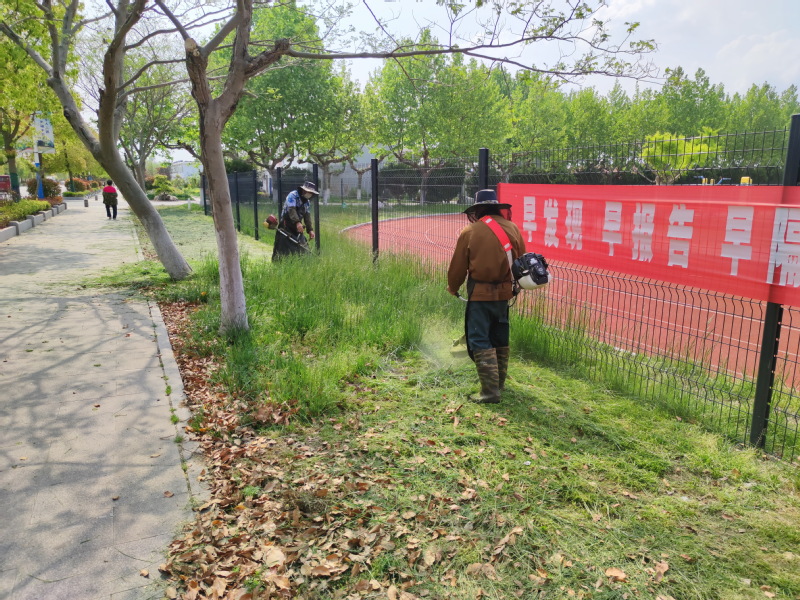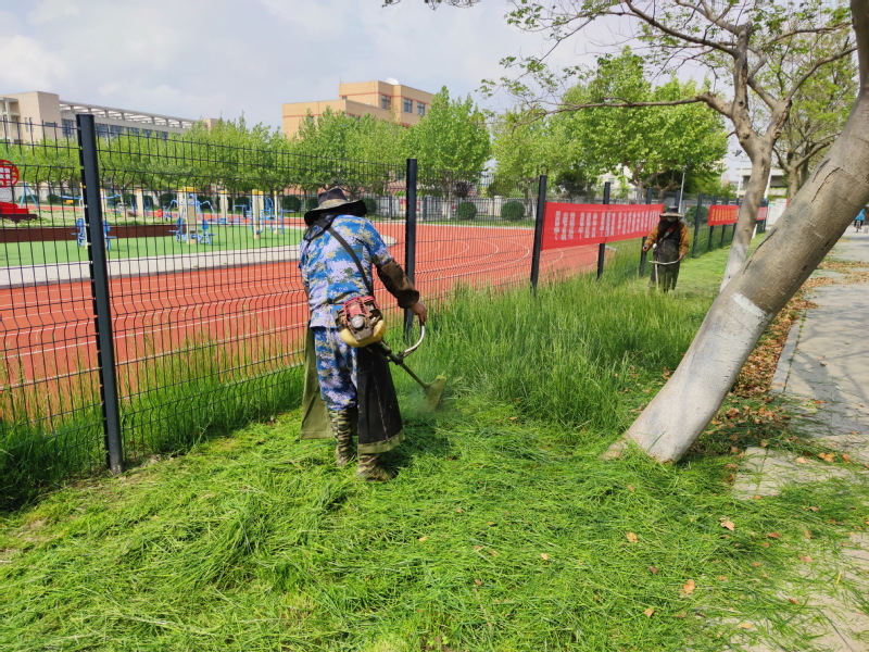 5月11日中午,在淮海農(nóng)場(chǎng)職工休閑體育運(yùn)動(dòng)廣場(chǎng)圍欄外側(cè),兩個(gè)全副武裝的環(huán)衛(wèi)員工,正拿著“嗡嗡”馬達(dá)聲的草坪修剪機(jī)快速地修整著草坪,被剪下的雜草沿著一個(gè)方向噴濺著,隨即,被剪下來(lái)的雜草被隨后的環(huán)衛(wèi)職工清掃運(yùn)走,柵欄內(nèi)外草坪修剪不修剪的對(duì)比一目了然,一個(gè)齊整的草坪就出現(xiàn)在人們的眼前。