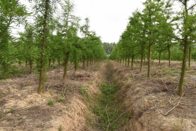 這片長約2400多米,寬達(dá)140多米的中山杉杉樹林,座落在五分場社區(qū)的最南端。我們站在堆堤上眺望,整個中山杉苗木基地杉樹林甚為壯觀,不但栽植直度較為標(biāo)準(zhǔn),而且樹苗縱橫交錯整齊劃一,非常爽目。今年苗木管理中心在中山杉杉樹林已經(jīng)生長較旺盛的基礎(chǔ)上,把林下沿襲兩年的冬瓜種植予以淘汰,避免生長期間冬瓜纏樹、冬瓜收獲時車輛運(yùn)輸傷樹等現(xiàn)象的發(fā)生,讓樹木專注生長,避免林下套種有可能對樹木造成的人為破壞。