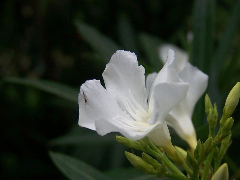 在農(nóng)場這里,夾竹桃的花有香氣,并且花集中生長在枝條的頂端,如果你遠看它們,它們聚集在一起的形態(tài)就好似一把浮在樹梢上似那張開的傘。你細瞧夾竹桃花,它的形狀像漏斗般,花瓣還是相互重疊,紅色的美、白色的純,看來別有一番洞天的感覺。