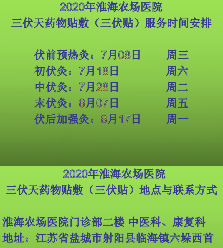 淮海農(nóng)場(chǎng)醫(yī)院對(duì)三伏天工作藥物貼敷(三伏貼)服務(wù)地點(diǎn)在農(nóng)場(chǎng)醫(yī)院門診部二樓的中醫(yī)科、康復(fù)科;時(shí)間安排如下:伏前預(yù)熱炙:7月8日周三進(jìn)行,初伏炙:7月18日周六安排;中伏炙:7月28日周二貼敷;末伏炙:在8月7日周五候診。