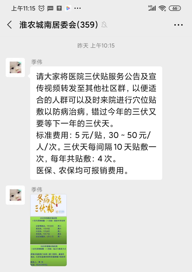 三伏是一年中最熱的四十天,是天地之間所有隱藏在身體里的風(fēng)、寒、濕及隱藏在自然界里的各種病毒病菌等陰邪之氣現(xiàn)出原型之時(shí)。而在這陽氣最旺盛的季節(jié)乘勢(shì)祛除體內(nèi)久伏寒邪,可在根本上治療由寒邪引起的各種疾病。為此,射陽縣臨海中心衛(wèi)生院淮海農(nóng)場(chǎng)醫(yī)院通過在農(nóng)場(chǎng)管理人員微信群、農(nóng)場(chǎng)社區(qū)各居委會(huì)群中通過發(fā)布“三伏貼”服務(wù)公告及宣傳視頻的形式,進(jìn)行網(wǎng)絡(luò)預(yù)約服務(wù),此舉受到了深受各類因風(fēng)、寒、濕等疾病引發(fā)痛苦的職工居民的歡迎。