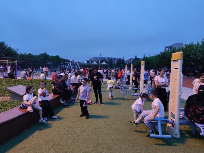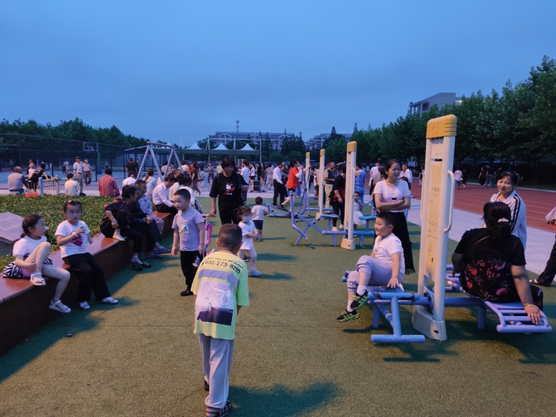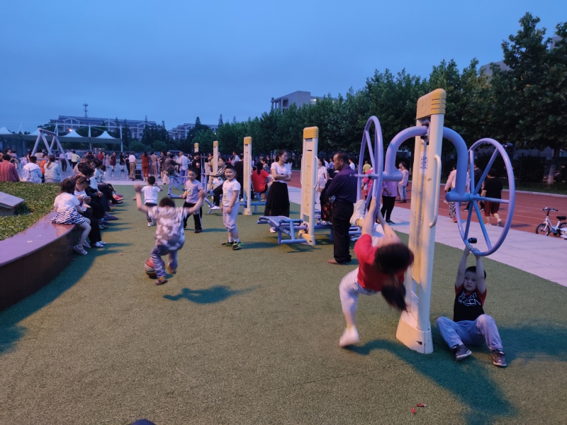 我們注意到,在農(nóng)場眾多的健身器材上,除因為安全原因,拆除的蕩秋千的筐籃外,這里還有孩子們喜愛的波浪橋、太空邁步器、橢圓跑步機、蹬腿器、大轉(zhuǎn)盤、小轉(zhuǎn)盤等,只要他們想玩,個子夠高、手夠長,他們都是要嘗試一下,在瘋玩中體會到了健身的快樂。在廣場上,他們除了玩轉(zhuǎn)健身器材外,在健身器材間、舞蹈池或是塑膠跑道上奔跑追逐又是他們常玩的活動之一,因為在這里玩耍,可以找到許多志同道合的玩友,大家聚在一起交流,可以在快樂中度過愉快的一天,并且在柵欄框圍的廣場內(nèi)運動,不會有像路上過往的車輛安全之憂,也可以讓陪著孩子的家長們,也有時間在廣場內(nèi)進行適當?shù)倪\動或是同孩子們一起互動,可謂在一舉多得中增進與孩子們的感情。