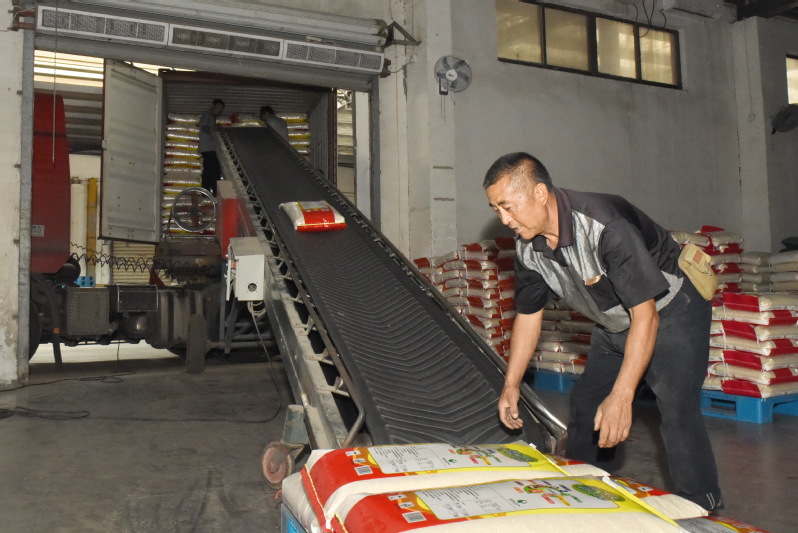 圖為公司搬運(yùn)工正在裝載渠星大米時(shí)的鏡頭。