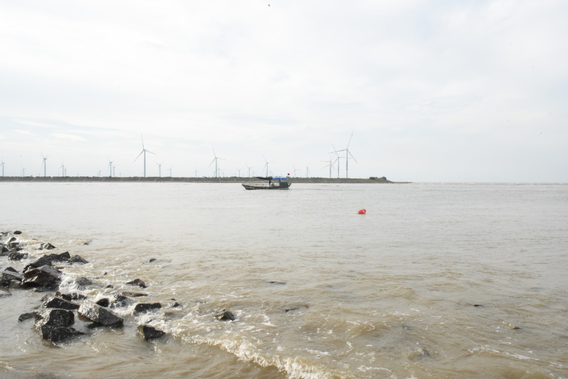 后因蘇北灌溉總渠的竣工和??陂l的先后興建,才改變了過去扁擔(dān)港的模樣。在南側(cè)的蘇北灌溉總渠六垛閘向海邊延伸的河道上,雖經(jīng)多次清淤,但幾公里長的河道上的治理效果并不好,始終出現(xiàn)在人們面前的是蜿蜒淺流的水道;而在北側(cè)海邊修建的則是非常壯觀的海口閘,內(nèi)側(cè)是清徹平靜的河水,外側(cè)則是黃濁翻滾的海浪,如果此時開閘,兩種水在不斷碰撞中融合在了一起,那些隨河水而下的魚類則難以忍受這種環(huán)境,在不斷的顛簸中流入海中或是成為人們的美食。那些海邊的燈塔、一字排開的擋浪水泥桿、搖曳的大風(fēng)車和深入到海水中的亭臺,無不成了觀賞風(fēng)景中的唯美角色。
