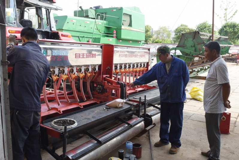 為做好農機人員對集團農機的保養(yǎng)力度,淮海農機維修保養(yǎng)總站還以各下轄農機站的集體農機進行分批次的統(tǒng)一地點存放、統(tǒng)一維修保養(yǎng)的形式,讓大家在農機的維護保養(yǎng)戰(zhàn)場上,進行農機維護保養(yǎng)技術的規(guī)范和維修水平的提升,從而也讓農機維護成為大家提升技能水平的大場所。圖為農機人員正在淮海維保中心進行機械設備維修時的場景。