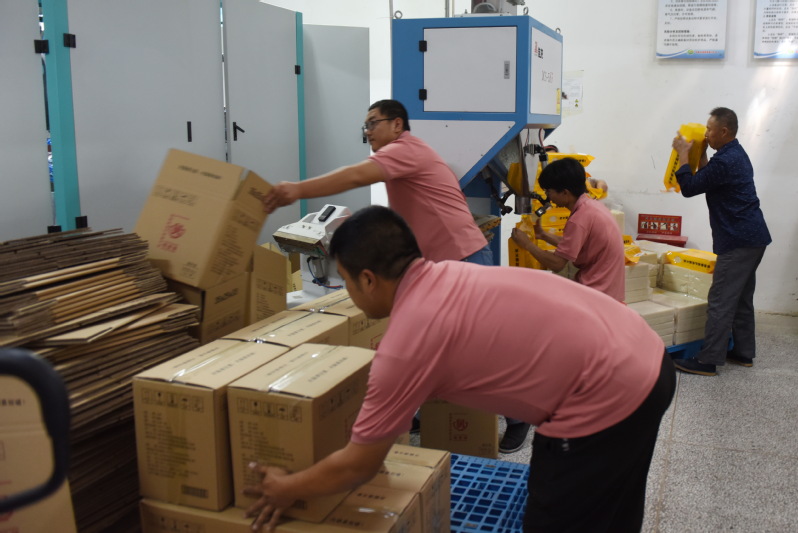 目前,隨著人們對食品安全的重視和對品牌大米的需求,淮海米業(yè)公司渠星牌中高檔大米日益受到了市場的歡迎,公司每年對真空大米包裝銷售的市場份額也在水漲船高,為此,公司開啟了兩條生產(chǎn)線,對市場厚愛的渠星小包裝大米進行加班加點的生產(chǎn),以滿足市場對渠星品牌的需求。圖為公司員工正在給大米進行裝箱時的鏡頭。