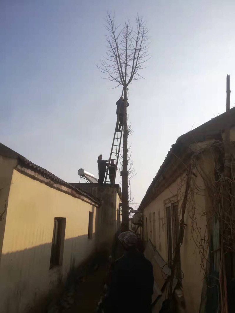 居委會接到反映后,立即對轄區(qū)各居民小區(qū)平房進行查看,轄區(qū)共發(fā)現(xiàn)三顆樹緊挨著居民住宅生長,其中最老的一棵樹樹齡有六十多年。居委會現(xiàn)場拍照取樣,直接將情況上報到農(nóng)場安委會,安委會吳漢軍主任對居委會反映的情況非常重視,他本人于當日下午與居委會主任臧成龍再次來到現(xiàn)場查看確認后,現(xiàn)場要求臧成龍務必在一個星期內(nèi)將這三棵樹砍伐,徹底消除隱患。