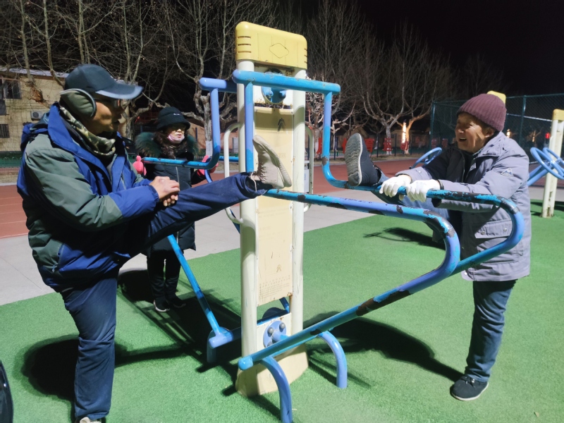 這是在3月2日晚上七點多,在淮海職工休閑體育運動廣場上,健身達人周少彪與一位老人進行對話時的鏡頭。