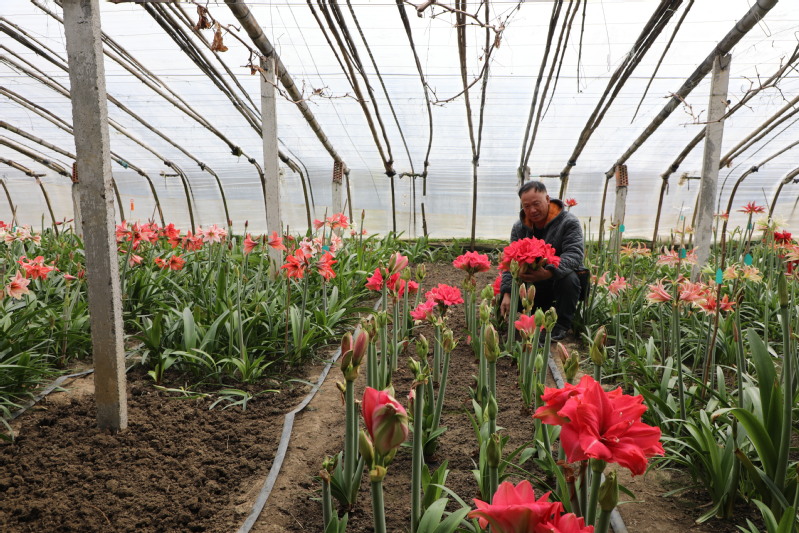 在十年漫長(zhǎng)的種植摸索過(guò)程中,幾乎每天都有新老客戸來(lái)信或上門(mén)向周恒銀學(xué)習(xí)、咨詢朱頂紅栽培技術(shù),周恒銀始終毫無(wú)保留,知無(wú)不言言無(wú)不盡地進(jìn)行講解和指導(dǎo),做到人無(wú)我有,人有我優(yōu),人優(yōu)我棄的種植管理模式。荷蘭種球公司的老外專家和北京瑞承、綠爾種球公司的負(fù)責(zé)人到周恒銀的朱頂紅基地考察后,無(wú)比驚嘆并充分肯定他培育出種苗;青年花農(nóng)寧昌近年一直種植蓬萊松,行情不好、產(chǎn)品滯銷,在接觸周恒銀的指導(dǎo)后,不但掌握了種植技術(shù),成功種植一個(gè)大棚的朱頂紅,而且能夠用電商平臺(tái)直播賣貨,成為了朱頂紅創(chuàng)新工作室一員;極兔快遞青年李超,看到周恒銀每天到他快遞分部發(fā)貨,了解到朱頂紅是網(wǎng)上電商銷售,網(wǎng)絡(luò)空間大、利潤(rùn)高,毅然放棄快遞業(yè)務(wù),跟周恒銀學(xué)習(xí)種植、直播電商,做起了花農(nóng)電商產(chǎn)業(yè),目前李超的兩個(gè)大棚朱頂紅也陸續(xù)上市,并且利用電商自產(chǎn)自銷。
