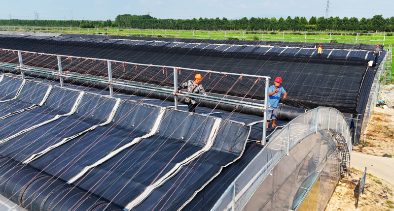 7月29日,連云港市海州區(qū)崗埠農(nóng)場,工作人員正在檢查、加固蔬菜大棚,防范臺風(fēng)“竹節(jié)草”。 耿玉和 徐衛(wèi) 攝(視覺江蘇網(wǎng)供圖)