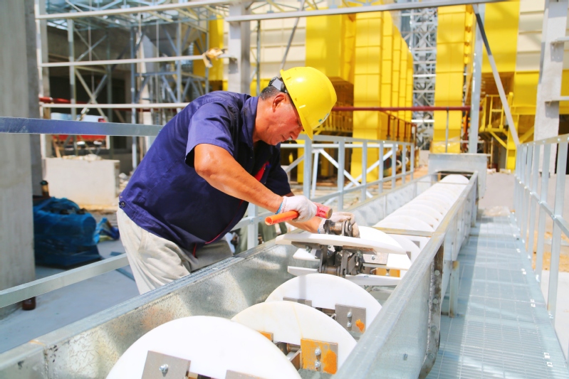烈日炎炎,崗埠農(nóng)場一線建筑工人在1200噸糧食烘干線建設(shè)現(xiàn)場頂著高溫進行焊接、組裝等作業(yè),堅守崗位,全力保障項目如期完工。