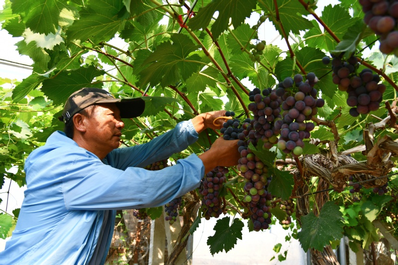 7月21日,走進淮海農(nóng)場葡萄園,工人們正給訂貨客戶采摘葡萄。園區(qū)種植夏黑、陽光玫瑰、甬優(yōu)等品種,隨著葡萄逐步成熟,訂貨客戶源源不斷。