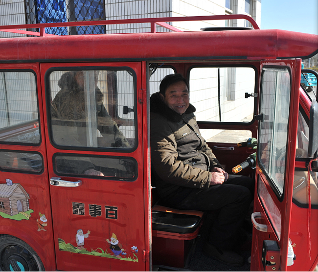 畫面中的駕駛員是淮海農場四分場社區(qū)54歲的黃玉青,弱智又低收入的他,每月靠400元的低保維持著簡單的生活。2017年農場組織科長林一高和四分場二十八大隊隊長王扣林與其結成精準幫扶對子后,他在獲得幫扶的同時,也更是激發(fā)了黃玉青自主創(chuàng)業(yè)的動力。黃玉青每天開著一輛百事鑫電動三輪車,停泊在醫(yī)院門前接客,在方便他人的同時,也為自己增加了收入。瞧,載著客人的黃玉青笑得是多么地燦爛。